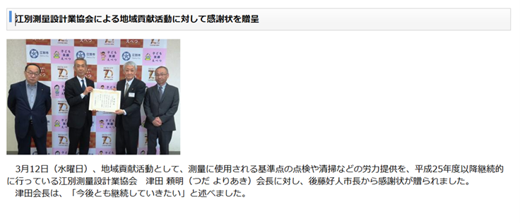 | 今後、街区基準点の設置など、事業の要望もお話してこの日の贈呈式を終えました。 | |||||||||||||||||||||||||